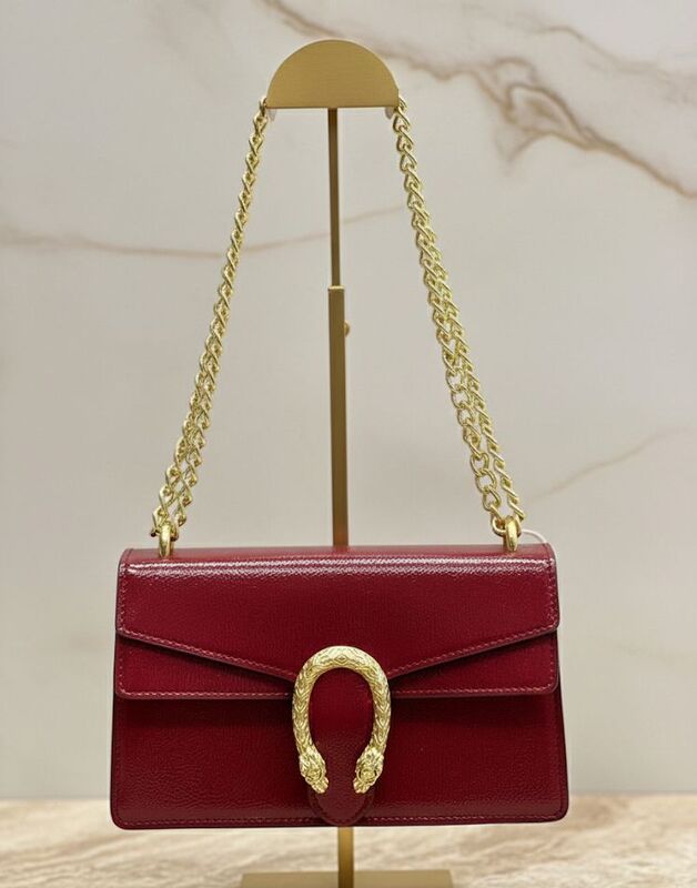 مصنوعة من الجلد الخمري عالي الجودة ، تتميز بتصميمها الأنيق والعصري. الحقيبة مزينة بسلسلة ذهبية لامعة وحلية على شكل حدوة حصان ذهبية اللون، مع شعار Gucci المميز.