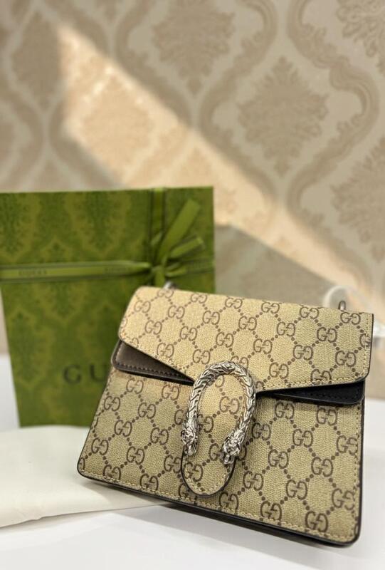 مع صندوق غوتشي أخضر اللون يحمل شعار الماركة، بالإضافة إلى قطعة قماش بيضاء ناعمة.