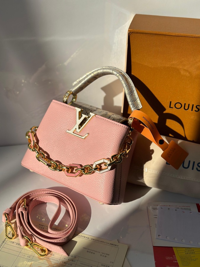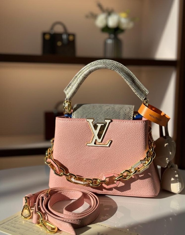 باللون الزهري ، مع شعار "لويس فيتون" باللونين الابيض ، ومقبض رمادي بجلد حية وسلسلة ذهبية مع حلقات بيضاء وزهري