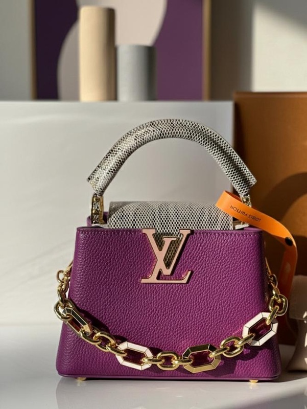 باللون النهدي ، مع شعار "لويس فيتون" باللون الزهري ، ومقبض رمادي بجلد حية وسلسلة ذهبية مع حلقات بيضاء