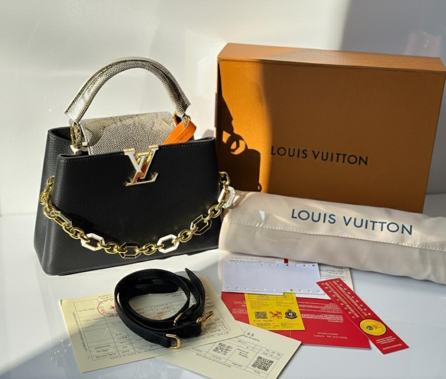شنطة راقية بتصميم أنيق من لويس فيتون، بتتميز بشعار LV الذهبي البارز من الأمام، وسلسال معدني ذهبي فاخر قابل للتركيب والفصل. الخامة فيها فخمة وثقيلة، والموديل ثابت وما بيهبط.