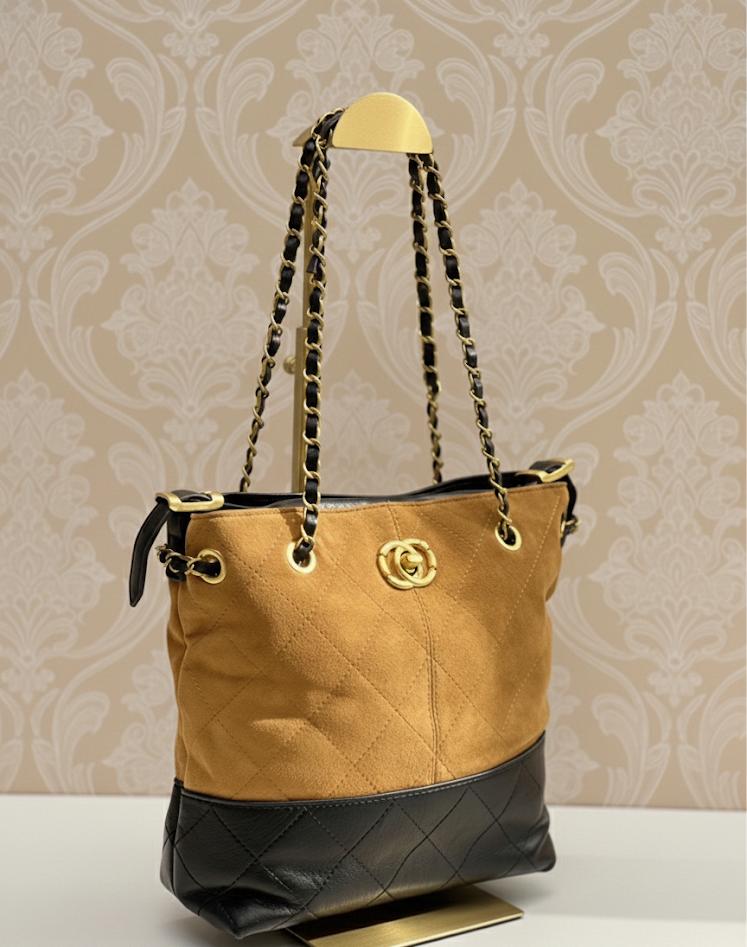 شنطة أنيقة بتصميم كلاسيكي فاخر، نصها مصنوع من الجلد الناعم ونصها الآخر من الشمواه الفاخر، مما يعطيها لمسة مميزة وأنيقة. الحجم عملي للاستخدام اليومي، وتفاصيلها تعكس جودة العلامة مع لمسة عصرية تناسب كل الإطلالات
