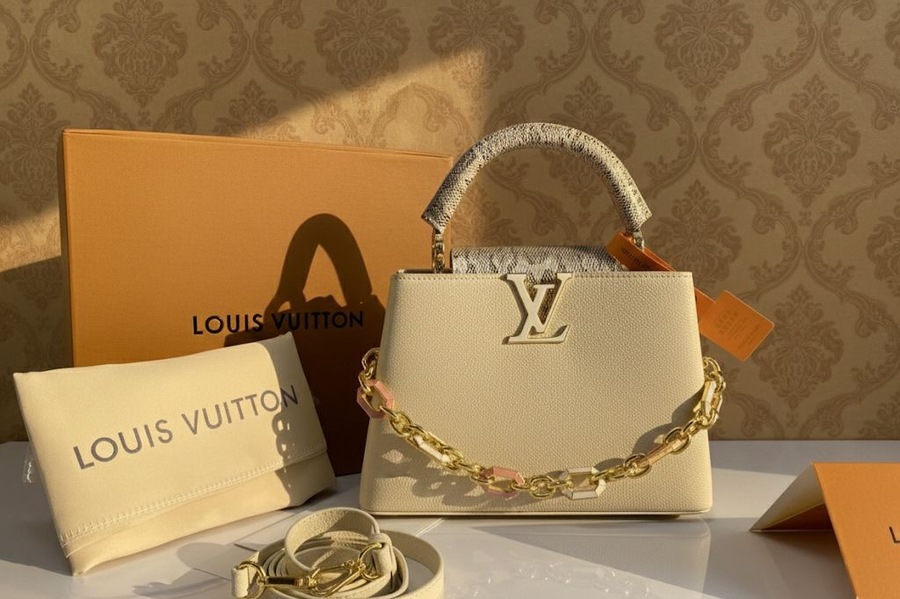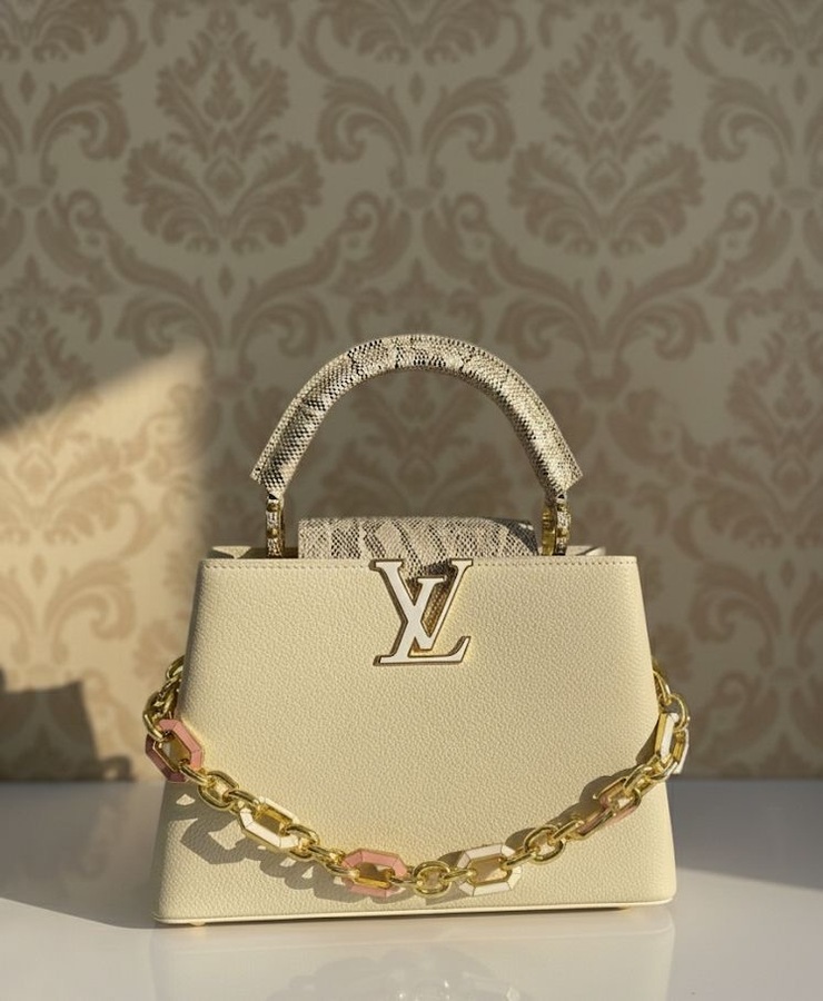 شنطة راقية بتصميم أنيق من لويس فيتون، بتتميز بشعار LV الذهبي البارز من الأمام، المقابض مصنوع من جلد بالوان جلد الافعى