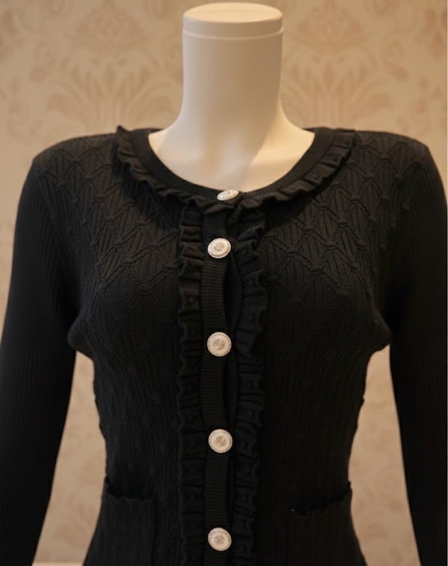 جرزاي شانيل اسود ذو اكمام طويلة. يتميز بتصميم كلاسيكي مع ياقة مكشكشة، وأزرار أمامية، وجيوب أمامية عملية. مصنوع من قماش ناعم ومريح