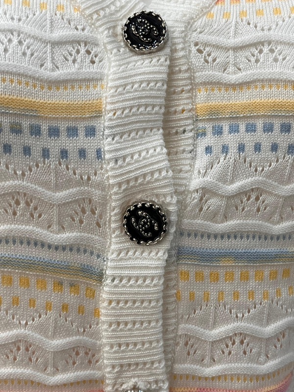 جرزاي شانيل ابيض بخطوط ملونة ناعمة ذو اكمام طويلة. يتميز بتصميم كلاسيكي مع ياقة واسعة على شكل V ، وأزرار أمامية ، وجيوب امامية مريحة