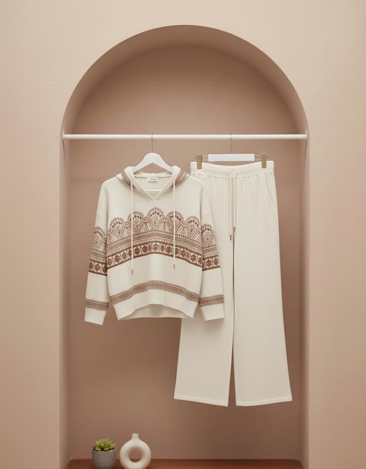 ترننج صوف ناعم بمستوى راحة عالي، بقصّة مرتّبة . خامته دافيه وخفيفة بنفس الوقت، عملي للطلعة وللبيت. البلوزة جاية بقصة بسيطة راقية، والبنطلون واسع ومريح بحركة مرنة. قطعة بتنعطى ستايل بدون أي مجهود، وبتنزبط مع أي لون وبتضلك لابسته مرتاحة طول اليوم