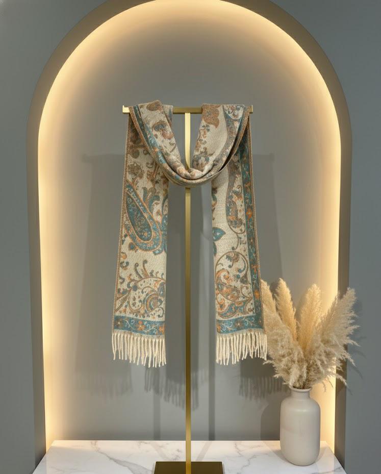 شال انيق بتصميم بوهيمي كلاسيكي. مصنوع الشال بخامة ناعمة وانسيابية تمنحك دفئًا وراحة