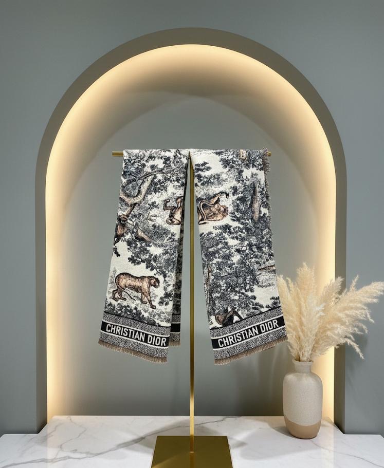 وشاح ديور باللون الابيض مع رسوم توضيحية سوداء، تعرض نمرًا وحيوانات مختلفة، أسفل شعار "CHRISTIAN DIOR"