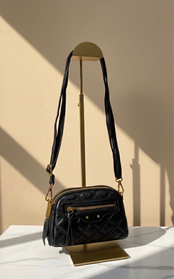 شنطة جلدية سوداء مبطنة بأسلوب كروس، مع مقصورة رئيسية بسحاب، وجيب خارجي صغير، وأجزاء معدنية ذهبية اللون، وتفصيل بشرابة معلقة من سحاب الإغلاق