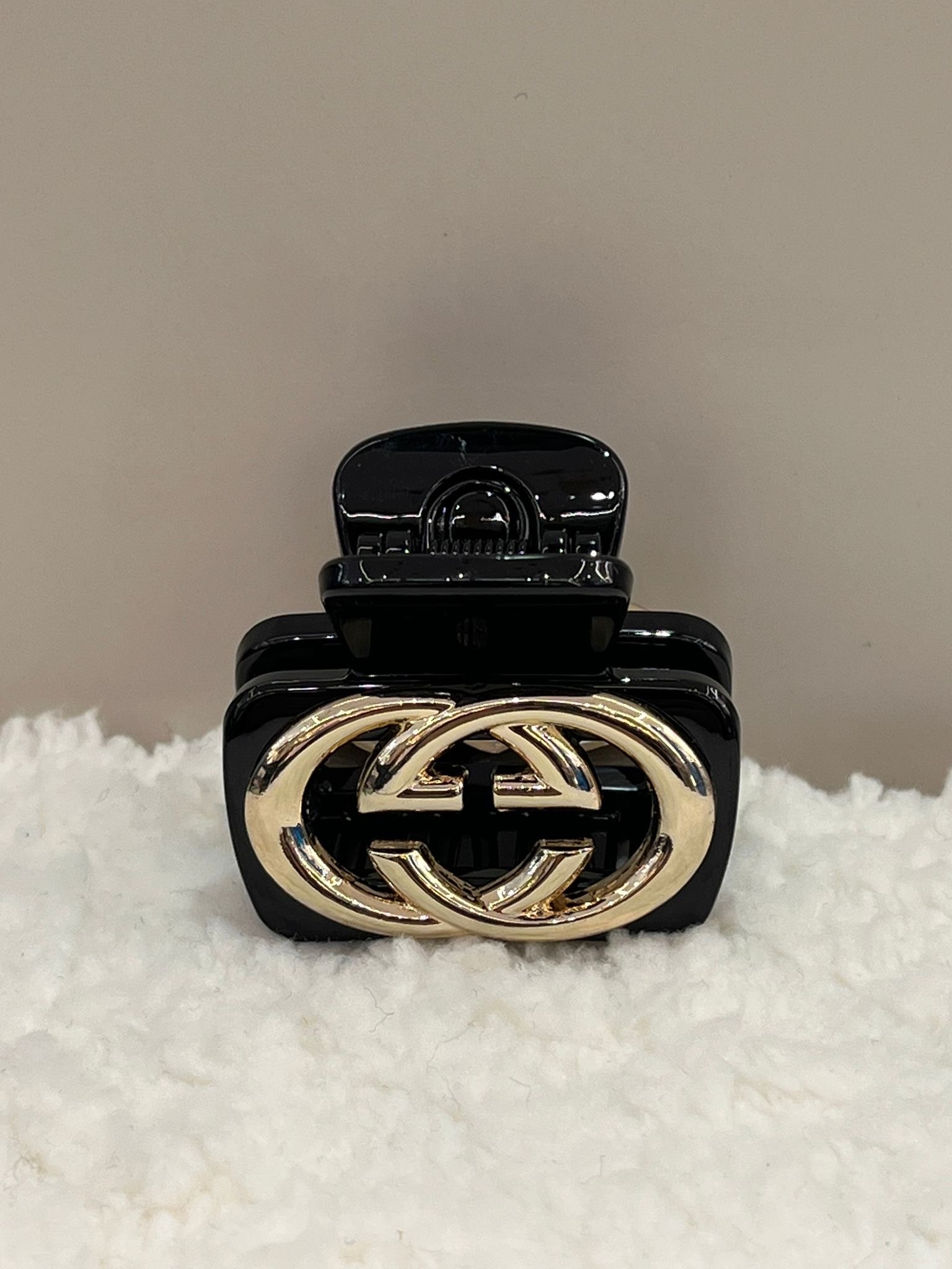 مشبك شعر أنيق بتصميم فاخر مستوحى من علامة جوتشي ، يتميز باللون الاسود اللامع مع شعار العلامة التجارية معدنية