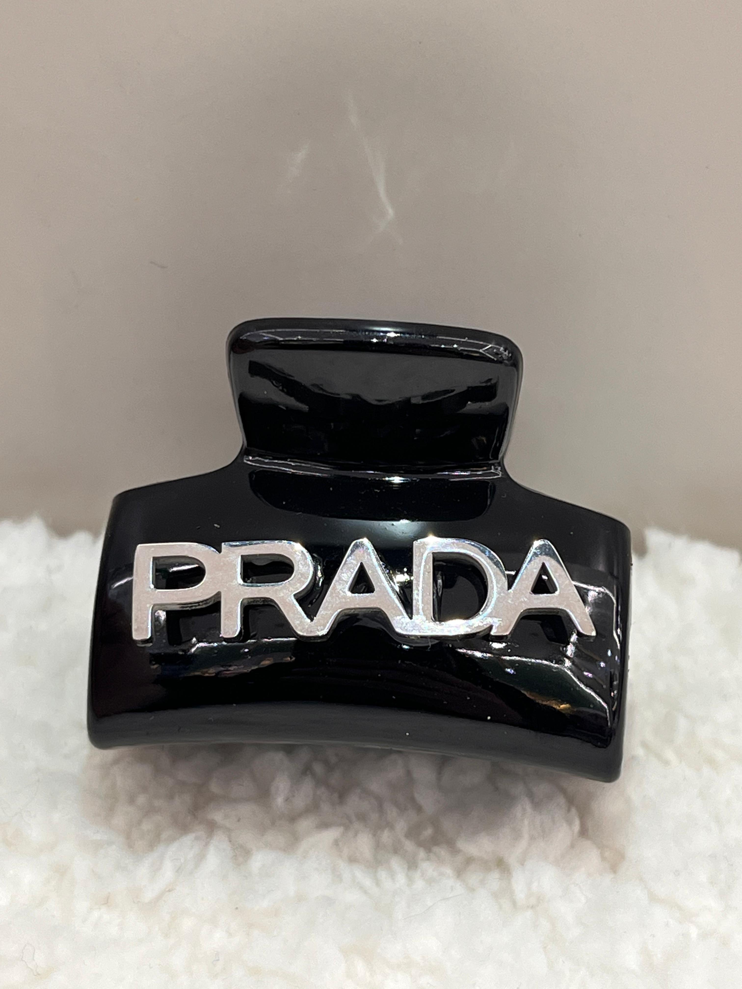 مشبك شعر أنيق بتصميم فاخر مستوحى من علا برادا ، يتميز باللون الاسود مع اسم العلامة التجارية باللون الفضي او الذهبي