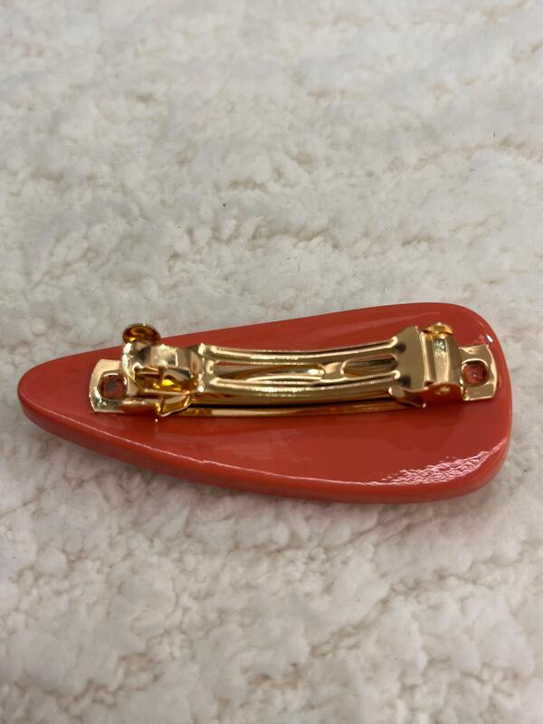مشبك شعر مصمم بتصميم عصري انيق من جوتشي باللون البطيخي مع ستراس فضي على الجوانب واسم العلامة التجارية جوتشي باللون الاسود