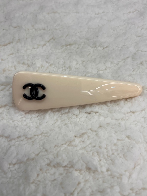 مشبك شعر مصمم بتصميم عصري انيق من شانيل باللون البيج مع شعار العلامة التجارية باللون الاسود