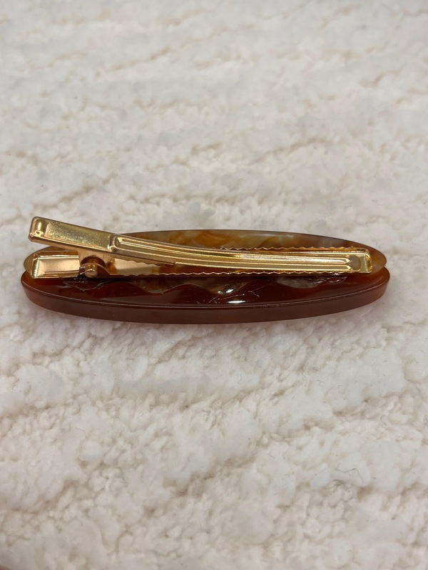 مشبك شعر مصمم بتصميم عصري انيق من miu miu باللون البني مع اسم العلامة التجارية باللون الاسود وستراس فضي على جانب الشكل