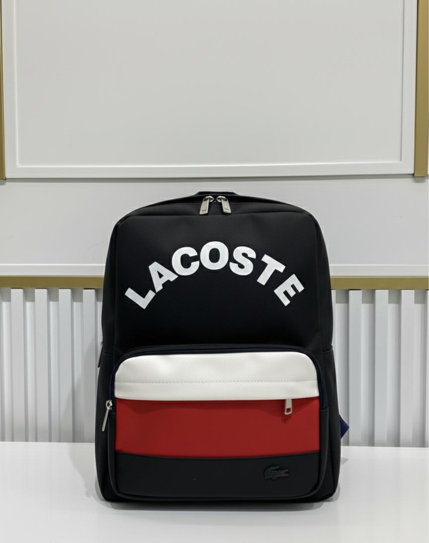 حقيبة ظهر أنيقة من Lacoste بتصميم عصري يجمع بين البساطة واللمسة الرياضية الراقية. مع اسم العلامة التجارية في الأعلى لإبراز هوية العلامة.