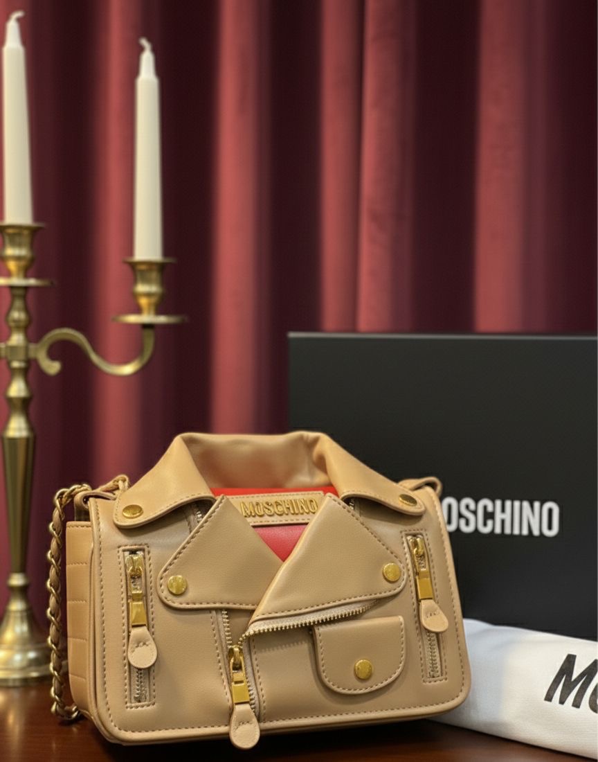 شنطة MOSCHINO بتصميم مميز مستوحى من جاكيت الجلد، تعكس جرأة وأناقة بنفس الوقت. مصنوعة بجودة عالية مع تفاصيل معدنية لامعة بتضيف لمسة فخامة واضحة. تصميمها العملي بحجم مناسب للاستخدام اليومي أو الطلعات، وبتلفت النظر بذوقها المختلف والعصري.