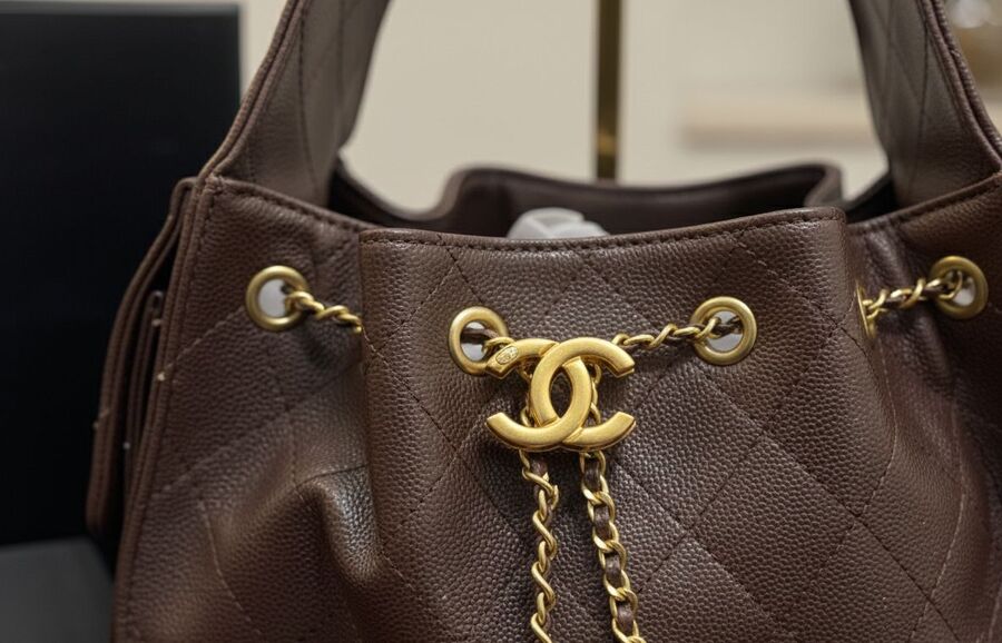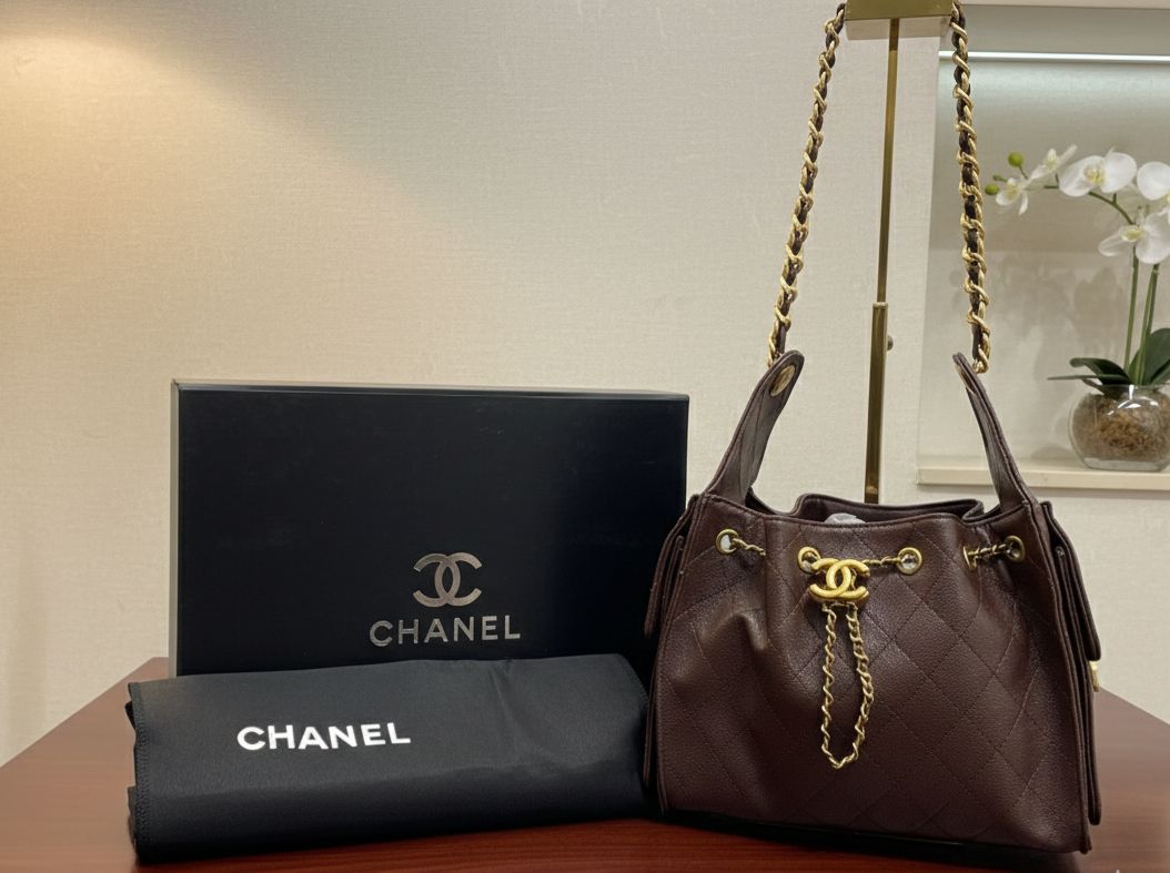 حقيبة شانيل الفاخرة بتصميم Bucket أنيق تجمع بين الرقي والعملية في آنٍ واحد. مصنوعة من جلد بني عالي الجودة بنقشة مبطّنة كلاسيكية تعكس هوية شانيل العريقة. تأتي الحقيبة بسلسلة معدنية ذهبية تضيف لمسة فخامة، مع إغلاق بحبل وسلسلة أمامية مزينة بشعار شانيل الأيقوني.