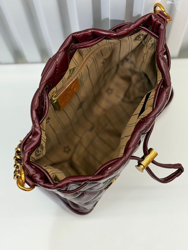 تتميز بلون خمري لامع جذاب مع خامة مبطنة بنمط مربعات كلاسيكي يعطيها لمسة فخامة واضحة. مزينة بتفاصيل معدنية ذهبية وعملات زخرفية أنيقة تضيف طابع مميز ولافت.