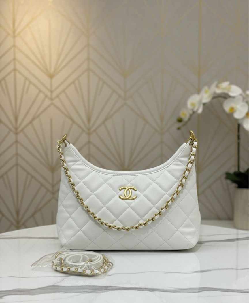 حقيبة نسائية أنيقة بتصميم فاخر يجمع بين الكلاسيكية والعصرية. تأتي بلون ابيض دافئ مع نقش مبطن أنيق يبرز فخامة التصميم، ومزينة بسلسلة ذهبية راقية تضيف لمسة من الأناقة والتميز. تتميز الحقيبة بحجم عملي مناسب للاستخدام اليومي أو للمناسبات،