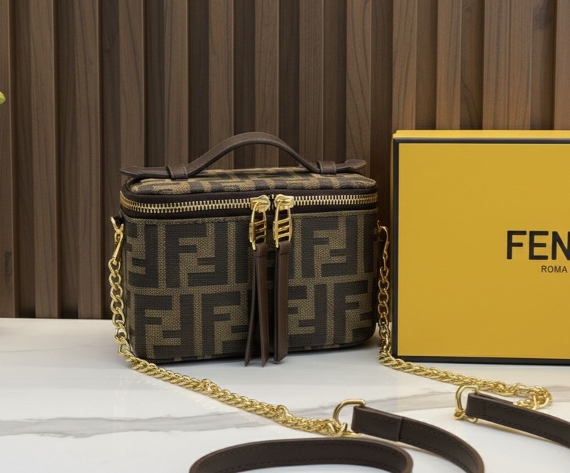 شنطة فيندي بتصميم مربع أنيق باللون البيج الغامق وحجم صغير عملي، مثالية لمحبي الستايل الراقي والخفيف. تصميمها فخم وبيلفت النظر، سهلة الحمل وبتناسب الطلعات اليومية والمناسبات. بتضيف لمسة أناقة واضحة لأي إطلالة بدون ما تكون مزعجة أو كبيرة