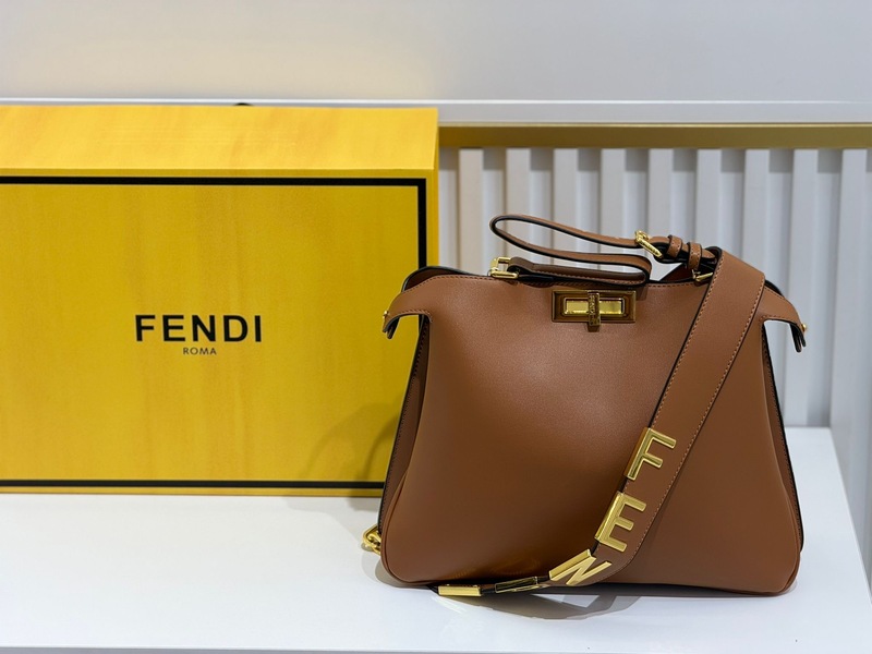 Fendi بتصميم فاخر يجمع بين البساطة والرقي. مصنوعة من جلد ناعم عالي الجودة بلون بني دافئ يعطيها لمسة كلاسيكية فخمة تناسب الإطلالات اليومية والرسمية. تتميز بقفل أمامي معدني ذهبي لامع يضيف تفصيلة جذابة، مع يد علوية مريحة وحزام كتف قابل للإزالة مزين بحروف ذهبية عصرية تضيف طابع مميز للشنطة.