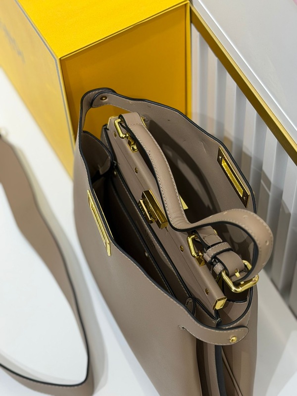 شنطة أنيقة من دار Fendi بتصميم فاخر يجمع بين البساطة والرقي. مصنوعة من جلد ناعم عالي الجودة بلون بني دافئ يعطيها لمسة كلاسيكية فخمة تناسب الإطلالات اليومية والرسمية. تتميز بقفل أمامي معدني ذهبي لامع يضيف تفصيلة جذابة، مع يد علوية مريحة وحزام كتف قابل للإزالة مزين بحروف ذهبية عصرية تضيف طابع مميز للشنطة.