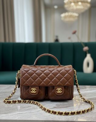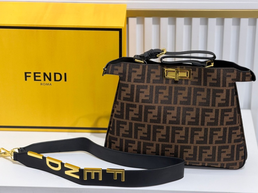 Fendi بتصميم فاخر يجمع بين البساطة والرقي. مصنوعة من جلد ناعم عالي الجودة بلون بني دافئ يعطيها لمسة كلاسيكية فخمة تناسب الإطلالات اليومية والرسمية. تتميز بقفل أمامي معدني ذهبي لامع يضيف تفصيلة جذابة، مع يد علوية مريحة وحزام كتف قابل للإزالة مزين بحروف ذهبية عصرية تضيف طابع مميز للشنطة.
