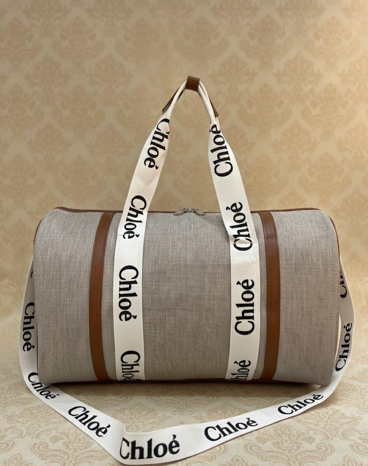 المقابض حزام من القماش بتصميم يبدا من قاعدة الشنطة الى الاعلى مع اسم العلامة التجارية