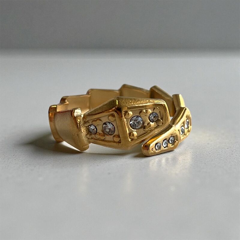 خاتم مصصم بشكل افعى ملتفه باللون الذهبي راس الخاتم وذيله محفور بدوائر صغيرة ستراس فضية