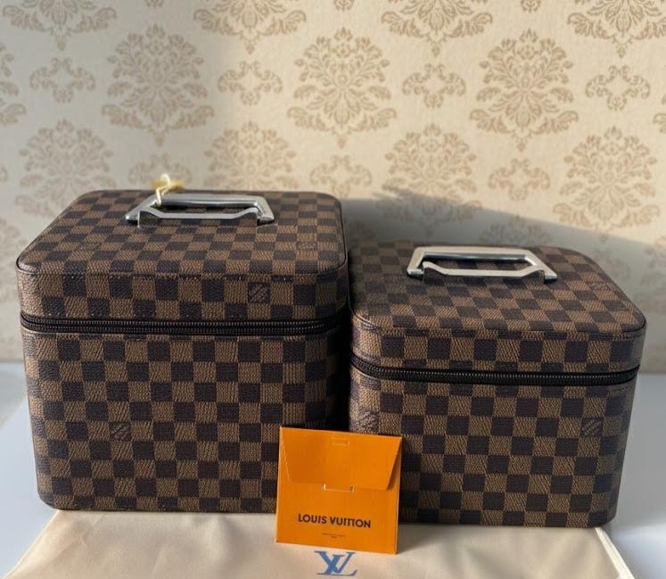 يتكون من صندوقان مكياج فخمَين بالوان مختلفة. ، أحدهما أكبر من الآخر، كلاهما بتصميم مُحاك بنقشة راقية وسحاب ذهبي فاتح، مع مقبض معدني لامع في الأعلى يمنحهما مظهرًا فاخرًا وعصريًا.