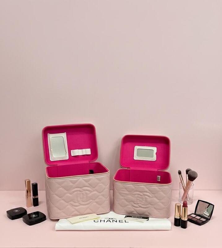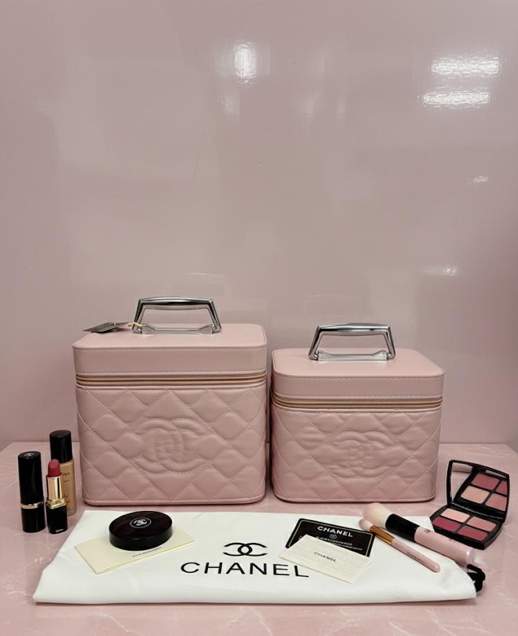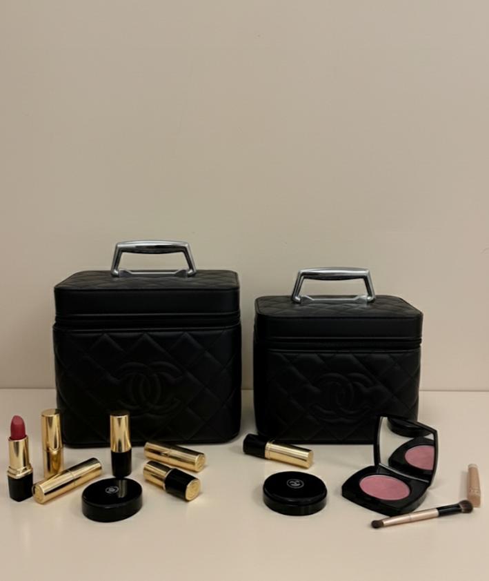 يتكون من صندوقان مكياج فخمَين بالوان مختلفة. ، أحدهما أكبر من الآخر، كلاهما بتصميم مُحاك بنقشة راقية وسحاب ذهبي فاتح، مع مقبض معدني لامع في الأعلى يمنحهما مظهرًا فاخرًا وعصريًا.