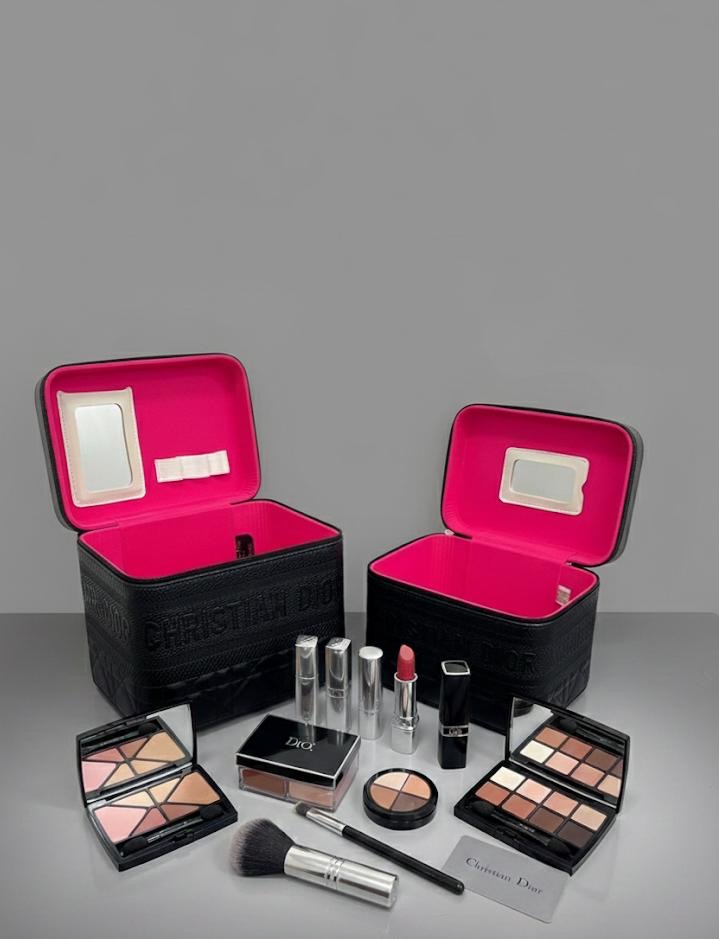 يتكون من صندوقان مكياج فخمَين بالوان مختلفة. ، أحدهما أكبر من الآخر، كلاهما بتصميم مُحاك بنقشة راقية وسحاب ذهبي فاتح، مع مقبض معدني لامع في الأعلى يمنحهما مظهرًا فاخرًا وعصريًا.
