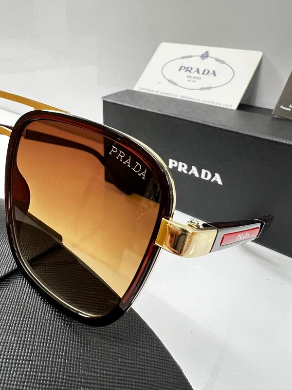 نظارة شمسي Prada بتصميم مستطيل عصري، عدسات ملوّنة تمنح رؤية مريحة، وإطار خفيف مع لمسات ذهبية على الذراع تحمل شعار برادا المميز. خيار أنيق ومناسب للاستخدام اليومي