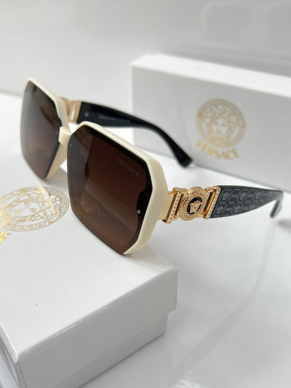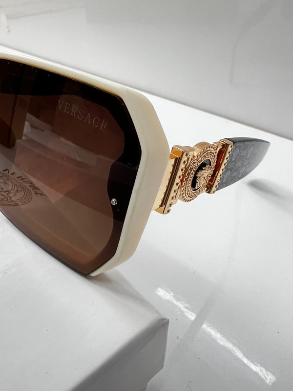 نظارة ڤيرزاتشي فخمة بإطار أوف وايت وعدسات بنيّة، تميّزها تفاصيل ذهبية وشعار ميدوسا على الذراع. قطعة أنيقة تلفت النظر