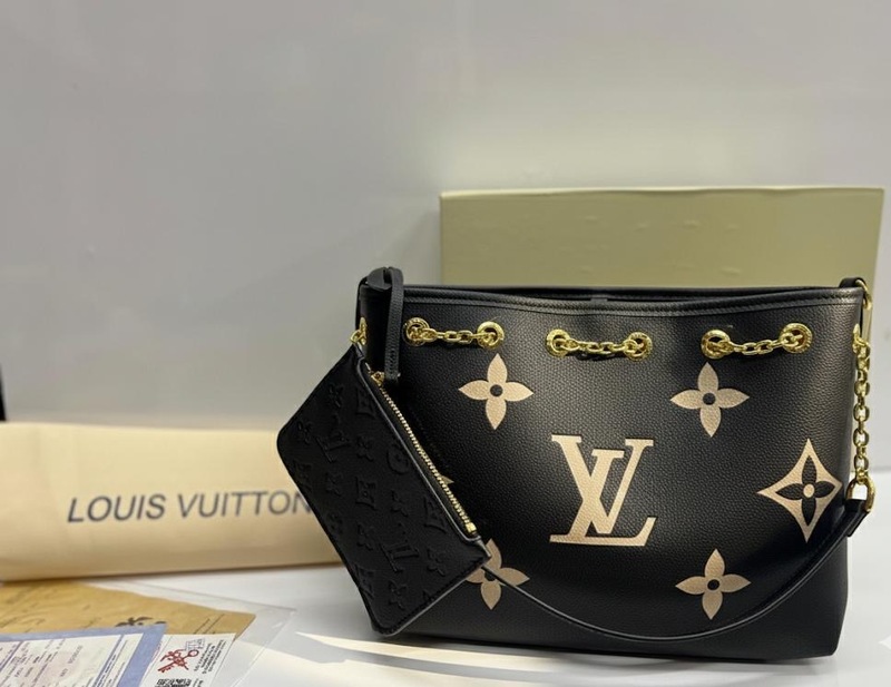 مصنوعة من الجلد الأسود عالي الجودة، وتحمل شعار لويس فويتون المميز. تأتي الحقيبة مع محفظة سوداء متطابقة تحمل نفس الشعار، بالإضافة إلى صندوق و كيس باللون البيج لحماية إضافية.