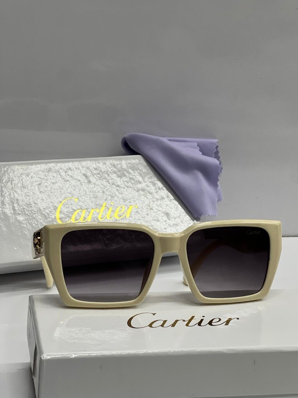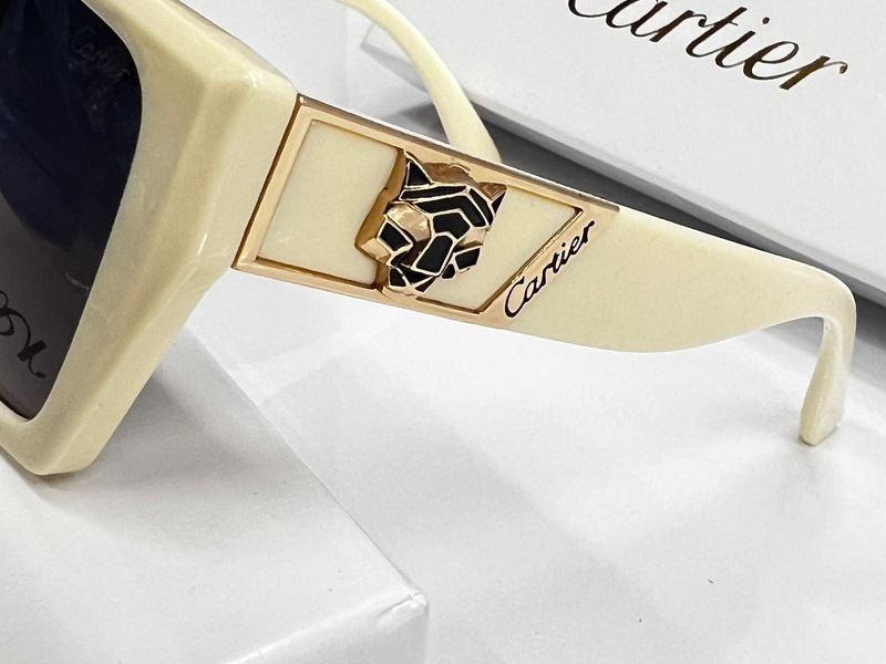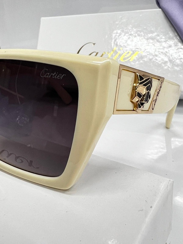 الشمسية بإطار مستطيل ، تتميز النظارة بإطار مستطيل باللون الأبيض العاجي، وعدسات داكنة تحمي العينين من أشعة الشمس، بالإضافة إلى علبة "كارتييه" بيضاء، وعلبة أخرى تحمل شعار "كارتييه"، وقطعة قماش نهدية