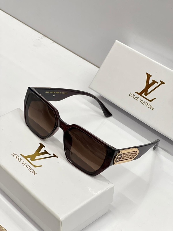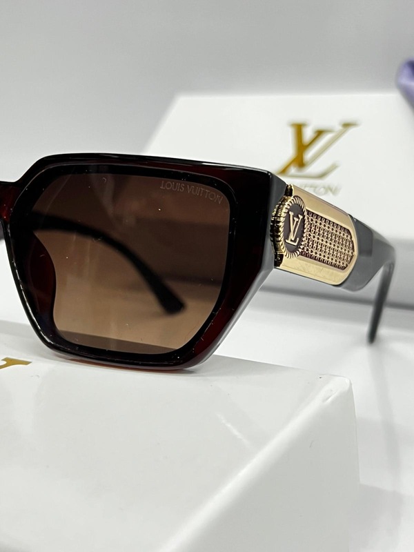 . تتميز النظارة بإطار داكن وعدسات بنية، مع تفاصيل ذهبية تزيد من جاذبيتها. تأتي النظارة مع علبة "لويس فيتون" بيضاء وشعار الماركة، بالإضافة إلى قطعة قماش للتنظيف باللون النهدي.