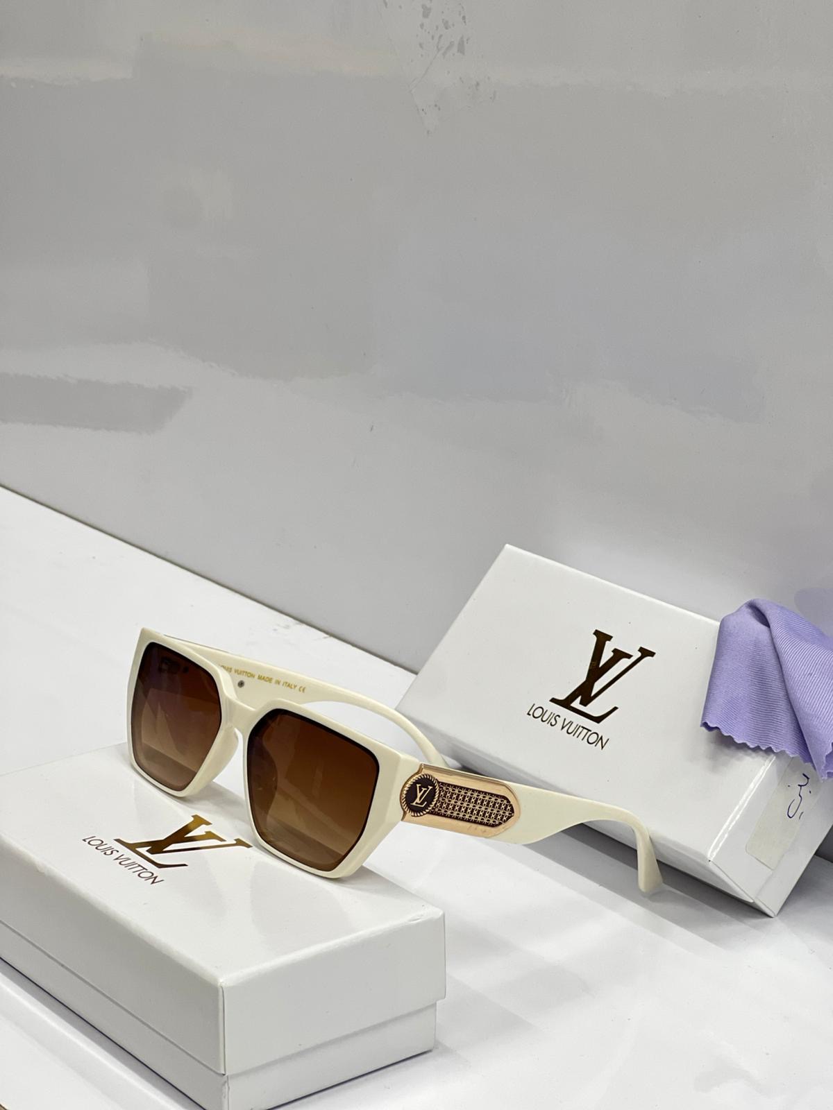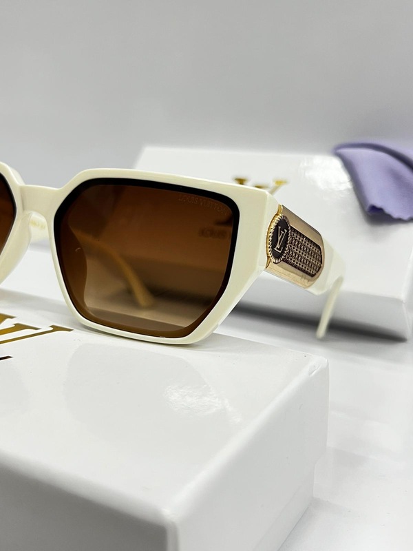 تتميز النظارة بإطار باللون الابيض وعدسات بنية، مع تفاصيل ذهبية تزيد من جاذبيتها. تأتي النظارة مع علبة "لويس فيتون" بيضاء وشعار الماركة، بالإضافة إلى قطعة قماش للتنظيف باللون النهدي