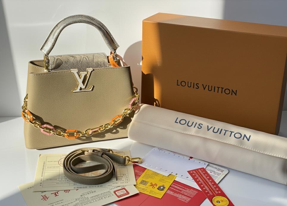 شنطة راقية بتصميم أنيق من لويس فيتون، بتتميز بشعار LV الذهبي البارز من الأمام، وسلسال معدني ذهبي فاخر قابل للتركيب والفصل. الخامة فيها فخمة وثقيلة، والموديل ثابت وما بيهبط.