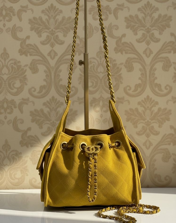 تفاصيل معدنية ذهبية لامعة تشمل حلقات السحب وسلسلة الإغلاق الأمامية. شعار دائري ذهبي في المنتصف يضيف لمسة راقية لواجهة الحقيبة و سلسلة كتف ذهبية فاخرة متداخلة مع الجلد، تمنح الحقيبة إطلالة أنثوية ملفتة
