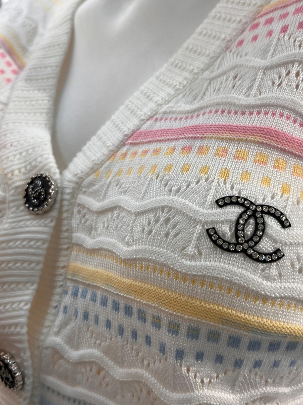 جرزاي شانيل ابيض بخطوط ملونة ناعمة ذو اكمام طويلة. يتميز بتصميم كلاسيكي مع ياقة واسعة على شكل V ، وأزرار أمامية ، وجيوب امامية مريحة