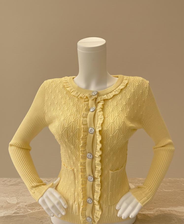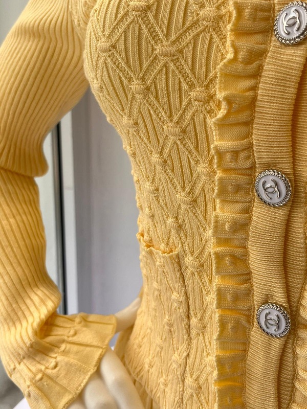 جرزاي شانيل اصفر ذو اكمام طويلة. يتميز بتصميم كلاسيكي مع ياقة مكشكشة وأزرار أمامية ، وجيوب امامية