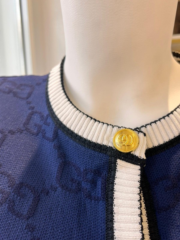 يتميز بتصميم كلاسيكي مع حواف بيضاء حول الياقة والجيوب والحاشية، وأزرار ذهبية أمامية.
