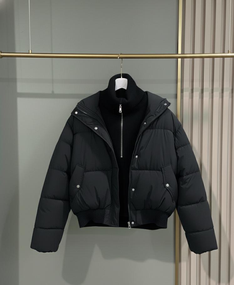 جاكيت منفوخ باللوان مختلفة ، مع بلوفر بنفس اللون برقبة عالية،