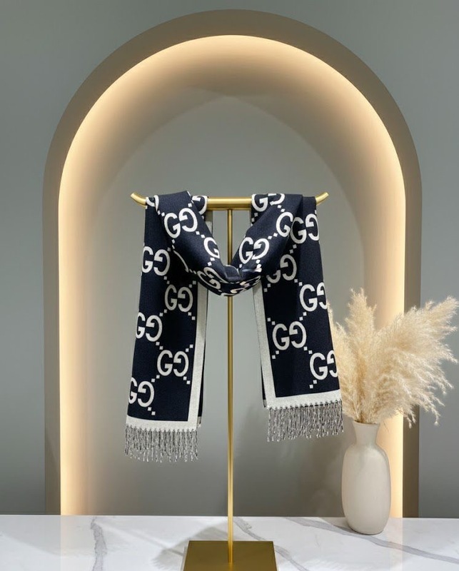 تبرز شعار "GG" المتشابك باللون الأبيض، والجهة الاخرى باللون الابيض مع شعار جوتشي المتشابك باللون الكحلي