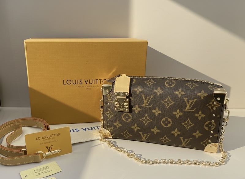تأتي الحقيبة بشكل مستطيل أنيق مع سلسلة ذهبية للحمل على الكتف أو كروس بودي، إضافة إلى حزام جلدي قابل للفصل لتعدد طرق الاستخدام. الإغلاق بسحّاب علوي مع قطعة معدنية تحمل شعار LOUIS VITTON، ما يعكس الدقة في التفاصيل وجودة التصنيع.