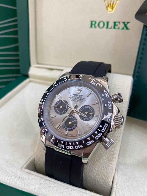 ساعة رولكس دايتونا تجمع بين الأداء الرياضي والفخامة الراقية، بتصميم أيقوني . تأتي بهيكل من الستانلس ستيل المصقول بعناية، مع إطار أسود مزوّد بتدرج قياس السرعة (Tachymeter) لإضفاء طابع رياضي أنيق.