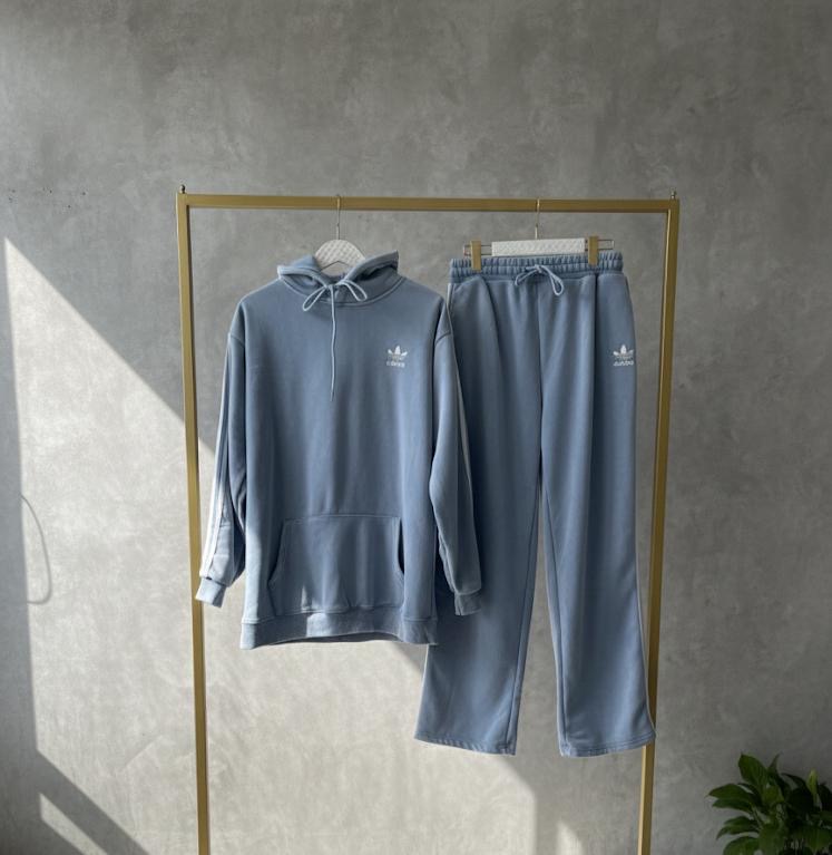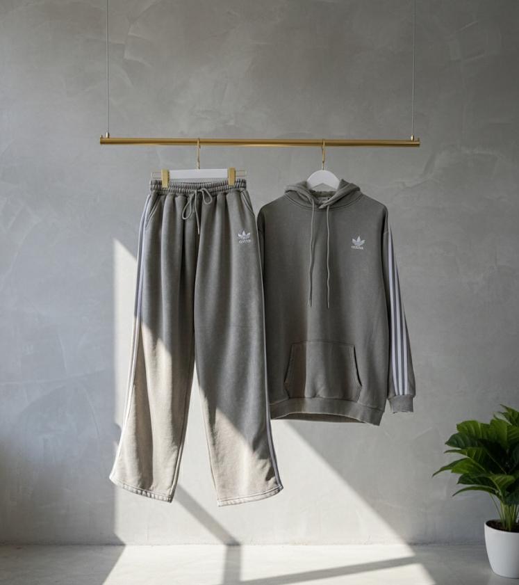مصنوع من صوف تقيل ، ومن جوّا ناعم وبيهدي الجسم. قصّته كلاسيكية وعملية، عليها لمسات أديداس المعروفة اللي بتعطيه شكل مرتّب وراقي بدون مبالغة. البنطلون جاي بقَصّة مريحة وما بضيّق، والجاكيت بيجلس حلو وبيعطي إحساس ثابت ودافي.
