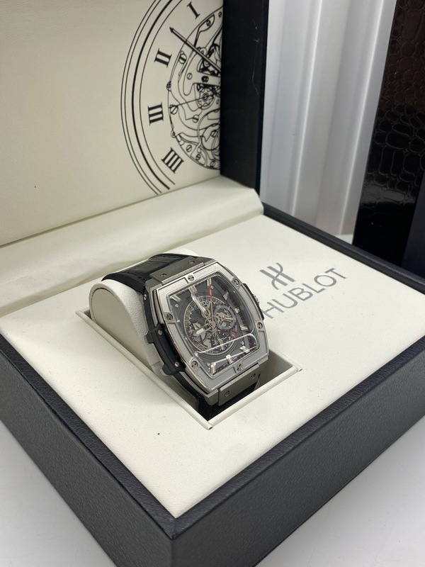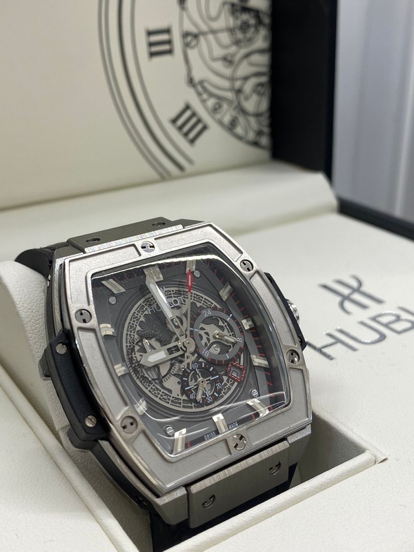 ساعة Hublot فاخرة بتصميم رياضي-أنيق يعكس قوة العلامة السويسرية ودقتها العالية. تأتي بعلبة مربعة مميزة من المعدن المصقول، مع قرص شفاف (Skeleton) يكشف تفاصيل الحركة الداخلية بأسلوب عصري وجذاب.
