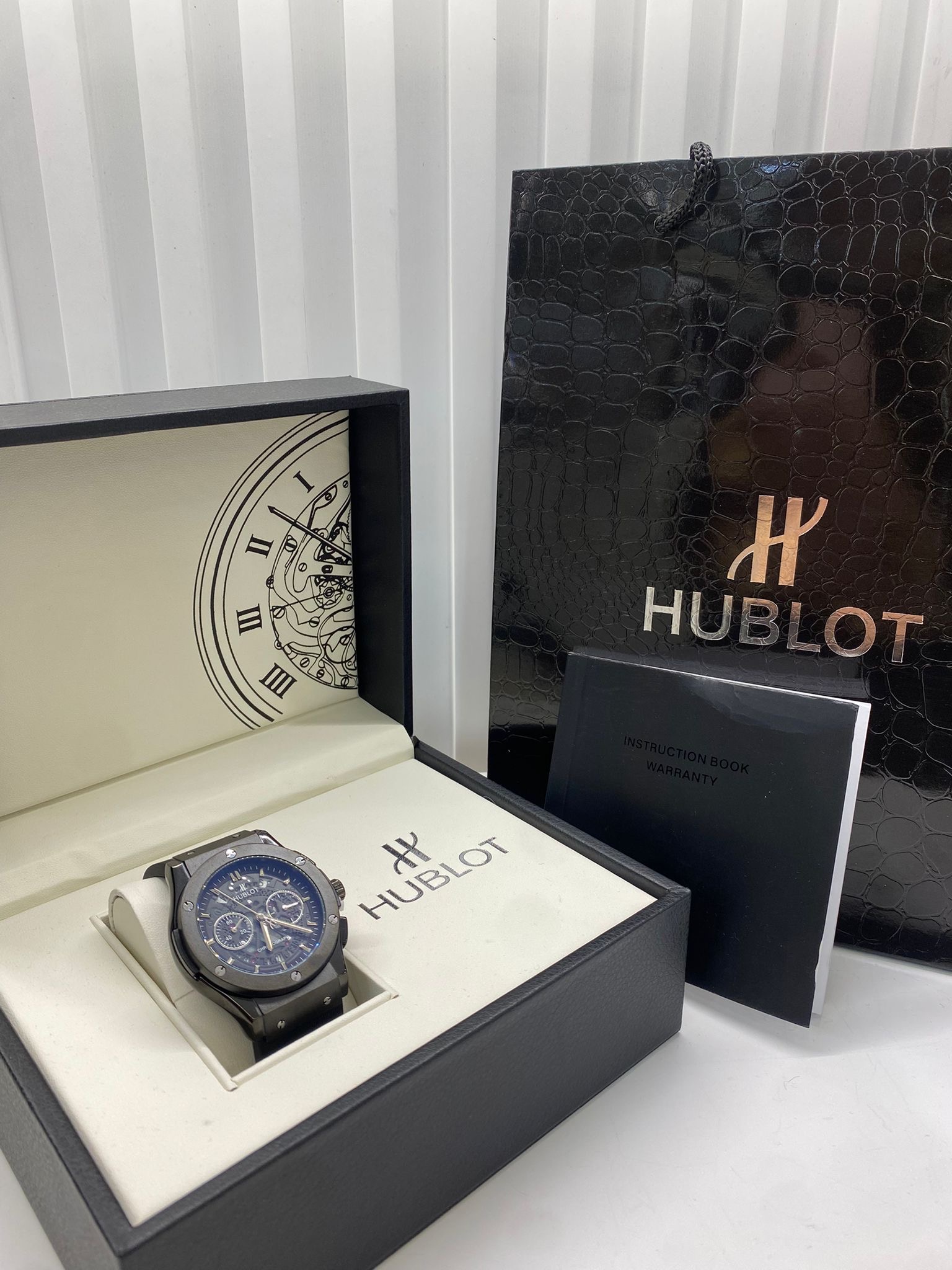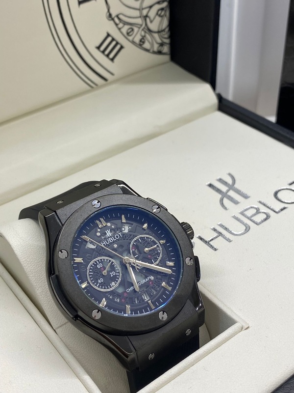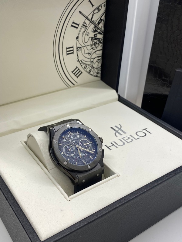 السوار مصنوع من المطاط عالي الجودة باللون الاسود مع لمسة عصرية مميزة، يوفر راحة مثالية ومتانة للاستخدام اليومي. تأتي الساعة داخل علبة Hublot الأصلية الفاخرة.